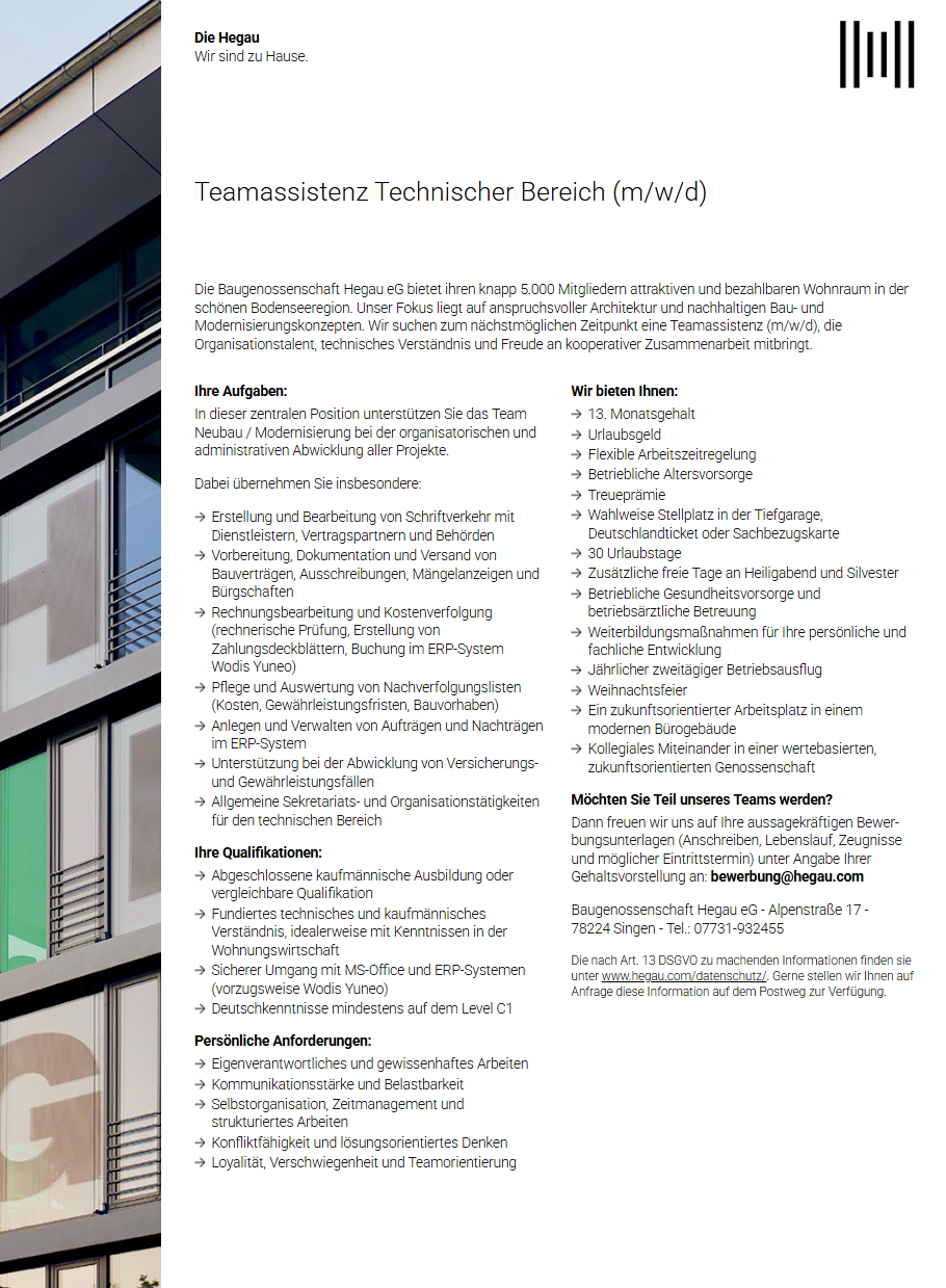 Wir suchen wir zum nächstmöglichen Zeitpunkt eine Teamassistenz (m/w/d), die Organisationstalent, technisches Verständnis und Freude an kooperativer